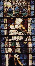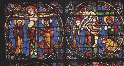 Quant aux vitraux, il faut être attentif aux couleurs. Le XIIe siècle voit la  dominance des couleurs bleu et rouge pour une représentation souvent limitée dans des panneaux ronds ou carrés. Comme l'exemple le montre, les scènes sont souvent de grands événements religieux comme ici la Passion du Christ (à gauche), mais les destructions  et divers remplacements ont engendré une rareté des vitraux de cette époque (50% de nos vitraux datent du XVIe siècle).