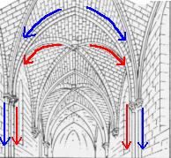 La voûte à croisée d'ogives, déjà existante avant, connaît son essor avec l'Abbaye de Saint-Denis. C'est un croisement de deux arcs qui permet d'augmenter la résistance (d'ailleurs le mot ogive vient du latin augere signifiant "augmenter"). Le schéma de droite présente la répartition habituelle de la poussée. Les différents arcs (formeret, doubleau) permettent de répartir la poussée, représentée en bleu et rouge, sur quatre points d'appui. Le poids de la voûte étant conduit par les arcs et absorbé par ces quatre points, le mur n'est plus un support mais un élément de remplissage au travers duquel les architectes percent de nombreuses fenêtres. Grâce à la voûte à croisée d'ogive, la luminosité devient désormais inséparable de l'art gothique.